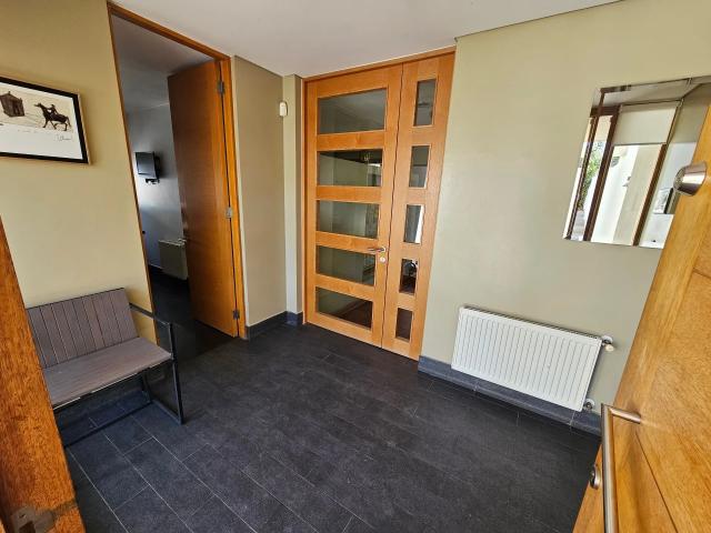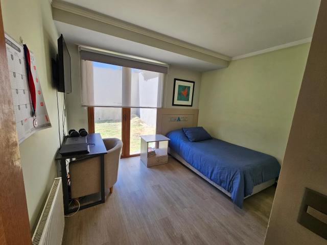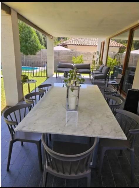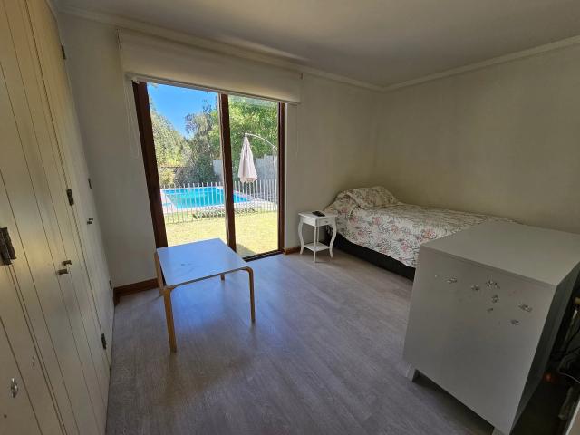 Su exterior invita al descanso con un encantador patio interior, terraza techada con quincho integrado y piscina. Equipada con termopanel, calefacción por radiadores, caldera y estacionamiento techado.