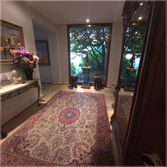 Amplio hall , living y comedor separados con salida a terrazas, vista hacia la piscina quincho.