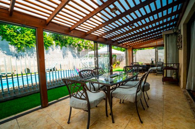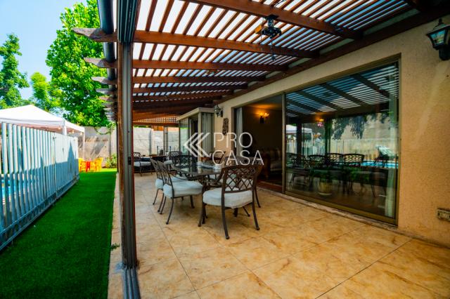 Destaca su amplia terraza con ventanales correderos, que permite integrarla a la casa en invierno y disfrutarla abierta en verano, ideal para reuniones familiares. El patio tiene una gran piscina y agradables áreas recreativas para niños; además de una vista panorámica que aporta tranquilidad y privacidad.