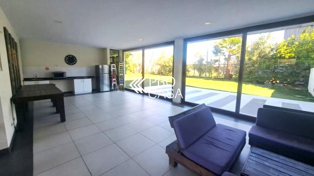 Sala de Eventos con refrigerador, cocina, parrilla en amplio jardín exterior.