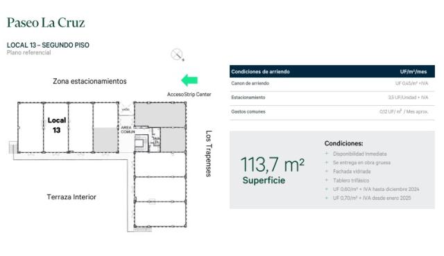 ProCasa La Dehesa (Oficina Carloshurtado Propiedades) ARRIENDA LOCAL COMERCIAL en el centro del Barrio Los Trapenses en La Dehesa, Comuna de Lo Barnechea. Ubicado en Strip Center Paseo La Cruz, con una vistosa plaza central, un lugar ideal para instalar gran variedad de actividades comerciales.