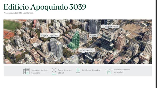 ProCasa La Dehesa (Oficina Carloshurtado Propiedades) ARRIENDA Espectacular OFICINA en Avenida Apoquindo en pleno Barrio El Golf de la Comuna de Las Condesa. A pasos de Estación de METRP El Golf, con Bancos, Hoteles, Restoranes y servicios a distancia caminable. Gran conectividad vial con autopistas urbanas. Variado transporte público a la puerta.