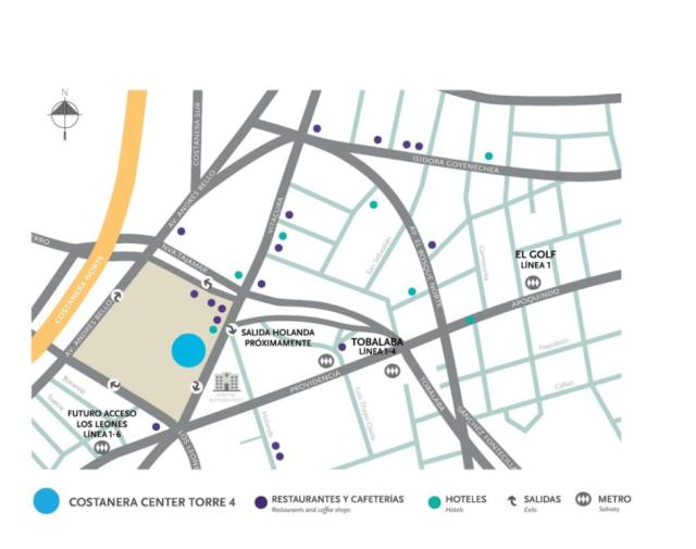 Cerca de la Estación de Metro Tobalaba, cuenta con variado transporte público y fácil acceso a las autopistas urbanas del sector oriente de la capital. Con comercio de todo tipo, esta oficina está ubicada en el Complejo que incluye el Mall Costanera Center con 7 pisos con oferta gastronómica, tiendas comerciales, supermercados y servicios en general.